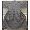 確りとした手触りの小さなフシと織り込んだ紬の織りで、青ネズ色の地織りに、四角暈しの柄を白で重ね織りした品。八掛けは正絹銀ネズ色無地で胴裏は正絹が付いた手縫い仕立て。