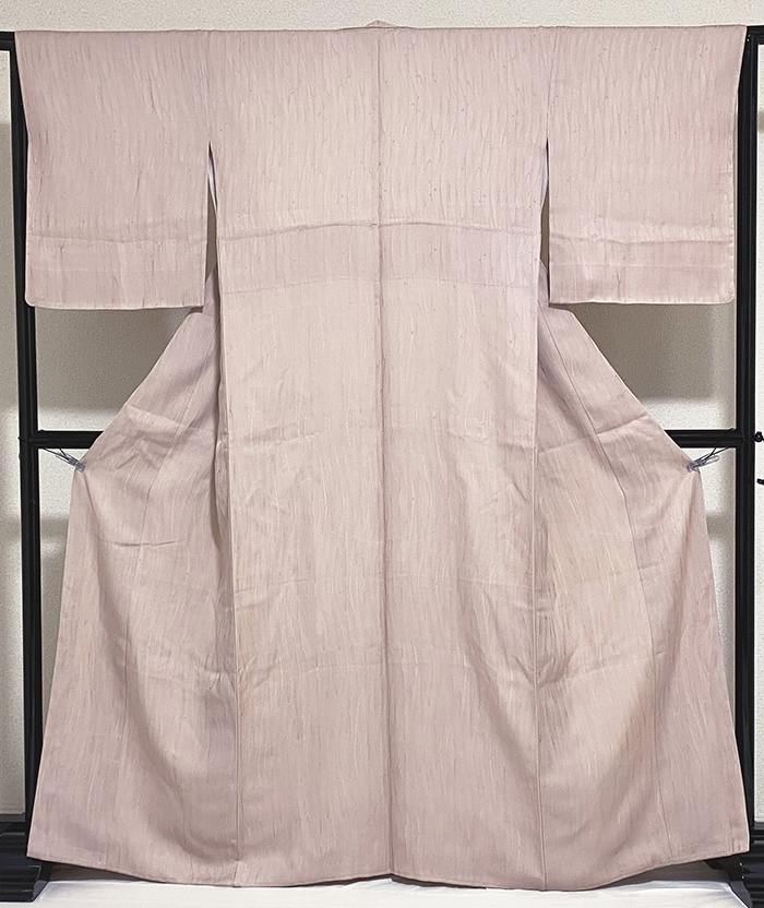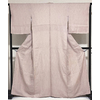 スベリの良い手触りの光沢のある縦に流れる地柄を織り込んだ紋意匠の生地を赤紫色が少し加わったくすんだ藤ピンク色無地で染め上げた品。八掛けは正絹表色暈しで胴裏は正絹が付いた手縫い仕立て。衿裏にはくるみホックが付いています。