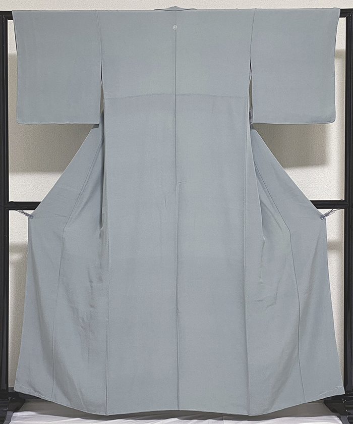 スベリの良い手触りで変わり一越の生地を青磁色に近いくすんだ青緑色無地で染め上げた品。八掛けは正絹表色無地で胴裏は正絹が付いた手縫い仕立て。