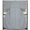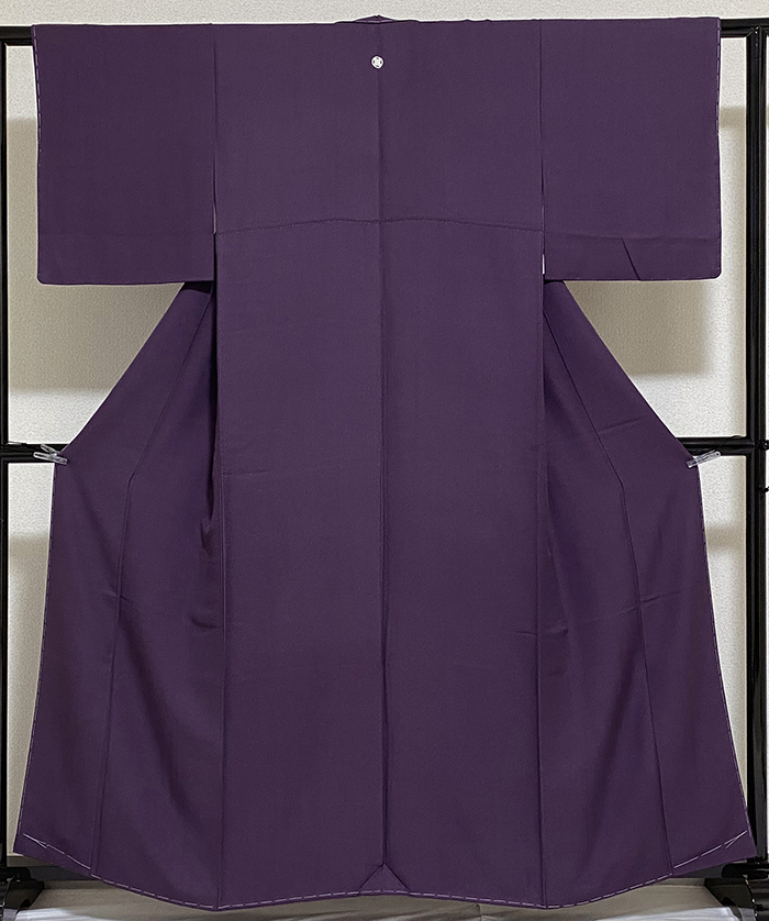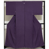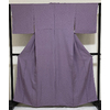 確りとした良い手触りで小さなアラレの地柄を織り込んだ紋意匠の生地をくすんだ紫色無地で染め上げた品。八掛けは正絹表色無地で胴裏は正絹が付いた手縫い仕立て。衿裏にはホック代わりに糸が付いています。