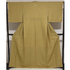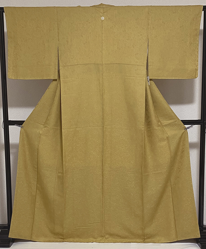 スベリの良い手触りの山並みの地柄を織り込んだ紋意匠の生地をくすんだウグイス色無地で染め上げた品。八掛けは正絹表色無地で胴裏は正絹が付いた手縫い仕立て。
