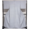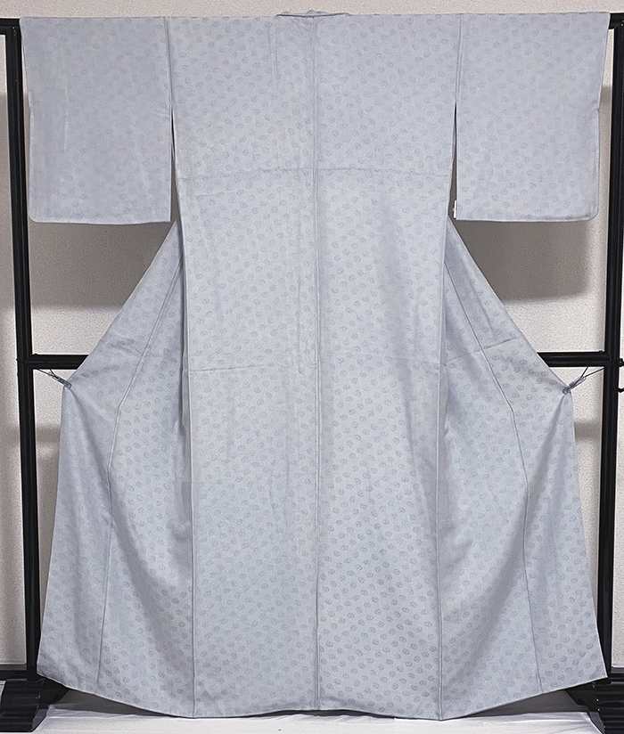 しなやかな良い手触りの小さな霜降りに小花の地柄を織り込んだ紋意匠の生地をくすんだ水色無地で染め上げた品。八掛けは正絹水色暈しで胴裏は正絹が付いた手縫い仕立て。