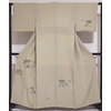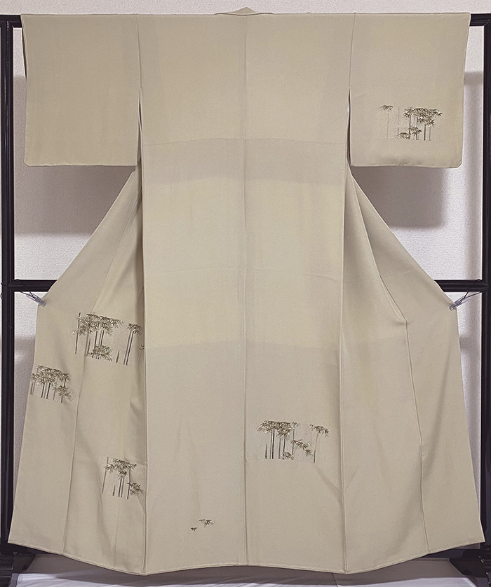 しなやかな手触りの変わり一越の生地を薄緑が少し加わったくすんだベージュ色に地染めし、上前からの四角取り竹の柄を銀糸の縦縞と、薄緑色濃淡やグレーなど刺繍で仕上げた品。八掛けは正絹表色無地で胴裏は正絹が付いた手縫い仕立て。衿裏にはくるみホックが付いています。