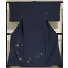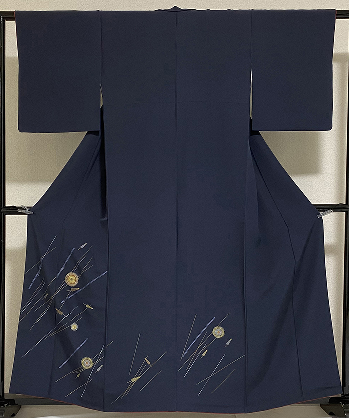張りのある手触りの変わり一越の生地を深い紺色に地染めし、上前からのと雨の抽象柄を青紫色の刺繍や金彩や黄赤色・深緑色などで染め、傘の柄を金糸と黄赤色に薄紫色などの色糸刺繍で仕上げた品。八掛けは正絹エンジ色暈しで胴裏は正絹が付いた手縫い仕立て。