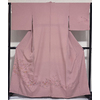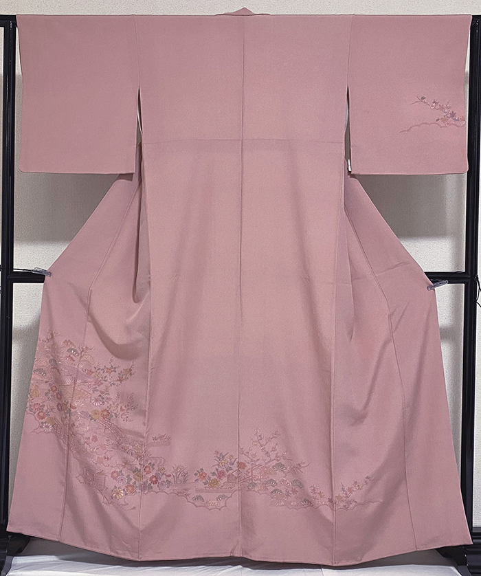 張りのある手触りの変わり一越の生地を優しい藤ローズ色に地染めし、上前からの花や御所車などの柄を薄緑色や黄赤色に金茶色などで重ね染めし、同色の手刺繍とスワトウ刺繍で仕上げた品。八掛けは正絹表色無地で胴裏は正絹が付いた手縫い仕立て。