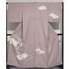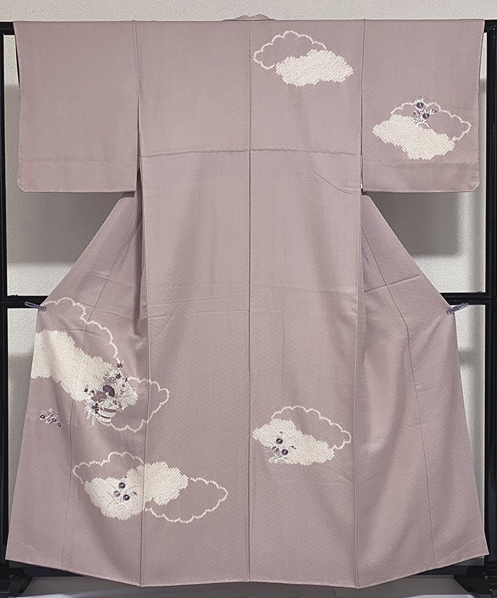 しなやかな手触りで光沢のある網代の地柄を織り込んだ紋意匠の生地をくすんだ藤ローズの渋い色に地染めし、上前からの雲の柄を白の鹿の子絞りで重ね染めし、花などの柄を赤紫や白などの色糸手刺繍で仕上げた品。八掛けは正絹赤紫色暈しで胴裏は正絹が付いた手縫い仕立て。
