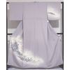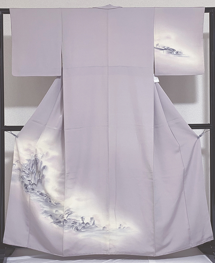 スベリの良い手触りで小さな地柄を織り込んだ紋意匠の生地を淡い藤ネズ色に地染めし、上前から優しいベージュ色暈しと、庭園の柄を墨色や赤紫色に銀彩を加え重ね染めした品。八掛けは正絹淡い藤紫暈しで胴裏は正絹が付いた手縫い仕立て。