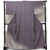 しなやかな良い手触りの変わり一越の生地をくすんだ紫色に、江戸小紋の青海波などの柄を白ネズ色で重ねて雪輪繋ぎの柄を地染めし、上前からの細縞の柄をベージュ色と小豆色で重ね染めした品。八掛けは正絹表と同じ色柄の品が付き胴裏は正絹が付いた手縫い仕立て。