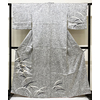 確りとした良い手触りの変わり一越の生地を墨ネズに地染めし、上前からの松葉など吹き寄せの柄を白と金茶色・金銀糸などの手刺繍で仕上げた品。八掛けは正絹表色無地で胴裏は正絹が付いた手縫い仕立て。パールトーン加工済み、下前衿先裏にタグがあります。