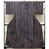 しなやかな良い手触りの縮緬の生地を青色やエンジ色・紫色・白ネズなどで細縞取りに地染めし、上前からのペイズリーなどの柄を地色濃淡で趣のある雰囲気に重ね染めした品。八掛けは正絹青ネズ色濃淡にベージュ色で鹿の子柄を染めた品が付き胴裏は正絹が付いた手縫い仕立て。