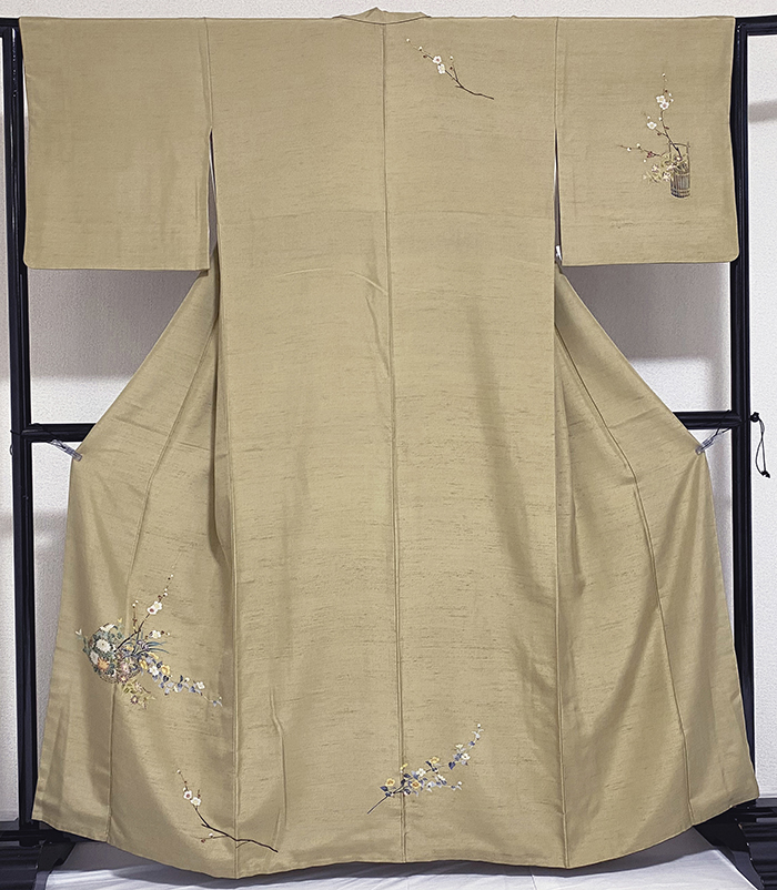 しなやかな手触りで小さなフシを織り込んだ紬の生地をくすんだ金茶色に地染めし、上前からの花柄に赤紫色や緑色に白ネズと小豆色などで丁寧に重ね染めした品。八掛けは正絹落ち着いたオリーブ色暈しで胴裏は正絹が付いた手縫い仕立て。衿裏にはくるみホックが付いています。
