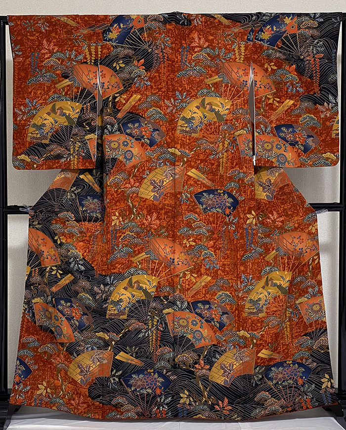 しなやかな手触りの縮緬の生地を黒とくすんだエンジ色の染め分けに地染めし、上前からの扇や花などの柄を緑色と金茶色に赤紫色に少しの金彩を加え重ね染めした品。八掛けは正絹エンジ色暈しで胴裏は正絹が付いた手縫い仕立て。ぐし縫いを施した丁寧な仕立ての品です。