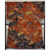 確りとした良い手触りの変わり一越織り生地で、深い紺色に染め、木立と花柄を地色濃淡と白ネズ色に少しの金彩を木立に染めた加工の品。八掛けは正絹表色無地でオクミ裏に柄を置き胴裏は正絹が付いた手縫い仕立て。下前オクミに作家落款があります。