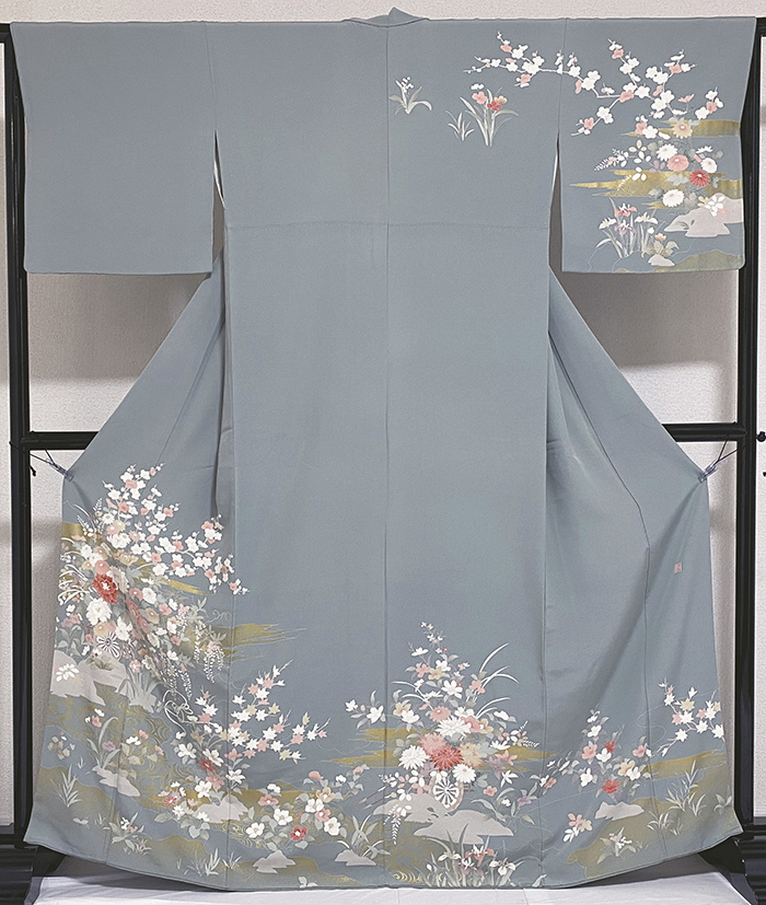 張りのある手触りで確りと打ち込まれた変わり一越の生地をくすんだ青磁色に地染めし、上前からの観世流水や花などの柄を白や紅色とくすんだ赤紫色に金彩を加え重ね染めした品。八掛けは正絹表色無地でオクミ裏に柄を置き胴裏は正絹が付いた手縫い仕立て。衿裏にはホック代わりに糸が付いています。下前オクミに作者落款があります。