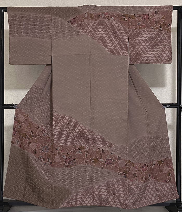 しなやかな手触りの無地意匠の生地をくすんだ薄小豆色に地染めし、上前からの濃いめ地色の裾暈しと、花柄をくすんだ薄エンジ色や少しの金彩などで重ね染めした品。八掛けは正絹くすんだ薄茶色無地で胴裏は正絹が付いた手縫い仕立て。七宝や菱などの小紋柄を染めたお洒落な仕上がりです。