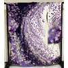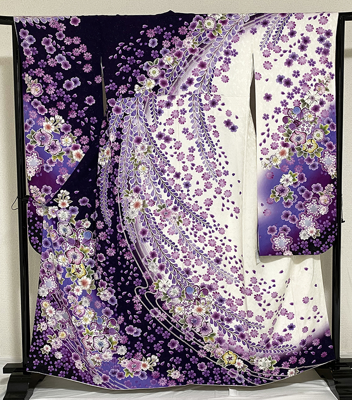 スベリの良い手触りで小さな地柄を織り込み、少しの銀糸を織り込んだ紋意匠の生地を深い紫と白の染め分けに地染めし、花柄を白ネズや金茶色に薄緑色などで重ね染めし、空絞りを加え仕上げた品。八掛けは正絹白無地で胴裏はポリエステルが付いたミシン縫い仕立て。