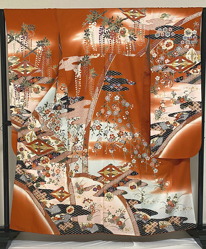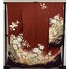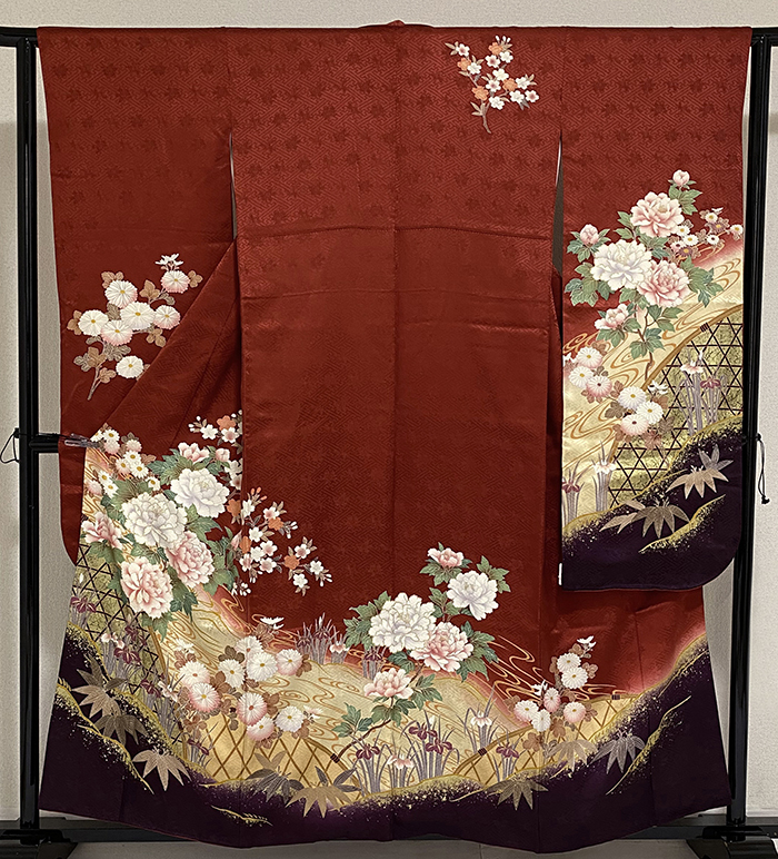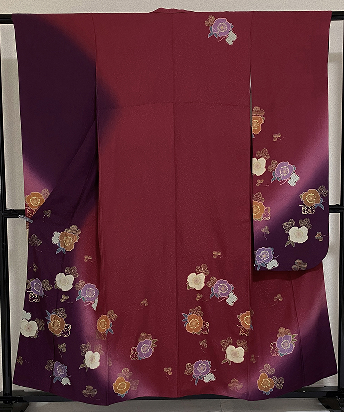 しなやかな手触りで光沢のある花サヤガタの地柄を織り込んだ紋意匠の生地をエンジ色に地染めし、裾に紫色と染め分けし、牡丹などの花柄を薄ピンクや薄緑色・白に金彩を加え重ね染めした品。八掛けは正絹表色無地で胴裏は正絹が付いた手縫い仕立て。