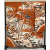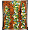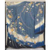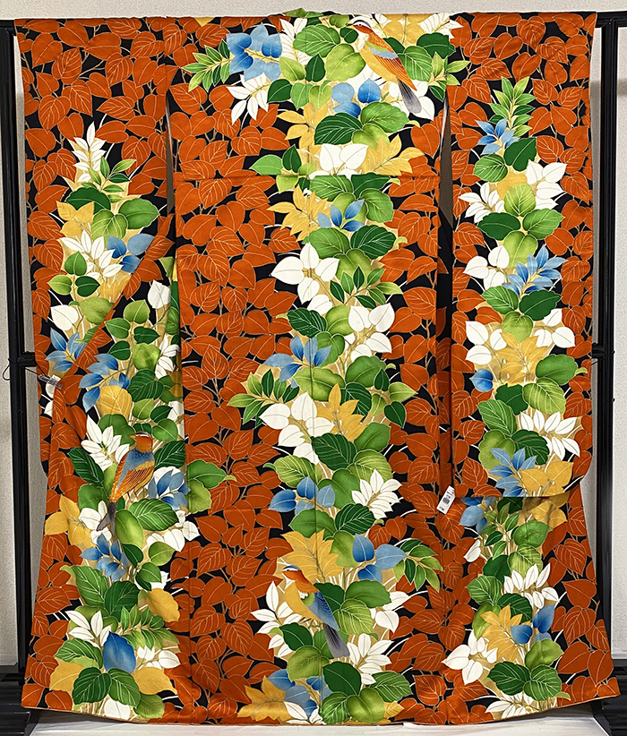 スベリの良い手触りで毘沙門亀甲の地柄を織り込んだ紋意匠の生地を黒に地染めし、葉と鳥の柄を青色や緑色に黄赤などと金の引き箔で重ね染めし、金駒刺繍を加え仕上げた品。八掛けは正絹薄オレンジ色暈しで胴裏は正絹が付いた手縫い仕立て。