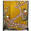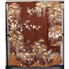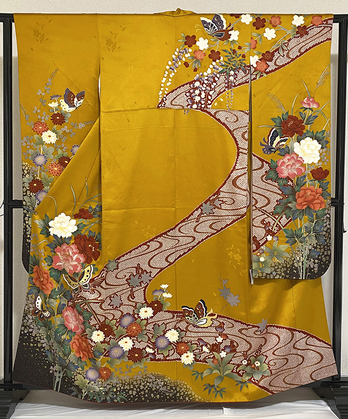 しなやかな手触りの真砂と桜の地柄を織り込んだ緞子の生地を華やかな金茶色に地染めし、裾の蘇芳色の染め分けと、花や蝶に鹿の子の柄を緑色やエンジ色にピンク色と金彩を加え重ね染めし、金駒刺繍を加え仕上げた品。八掛けは正絹鮮やかな紅色無地で胴裏は正絹が付いた手縫い仕立て。