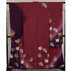 しなやかな良い手触りで小さなアラレの地柄を織り込んだ紋意匠の生地を暗い赤紫とローズピンク色暈しの染め分けに地染めし、花柄を白ネズに金茶色と薄紫・緑色などに金彩を加え重ね染めした品。八掛けは正絹ボルドー色無地で胴裏は正絹が付いた手縫い仕立て。衿裏にはくるみホックが付いています。
