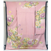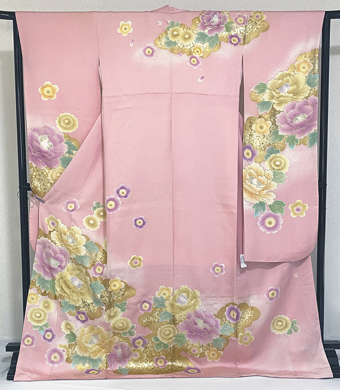 スベリの良い手触りで小さな地柄を織り込んだ上質な紋意匠の生地を華やかなピンク色に地染めし、雲の柄を金箔で染め、大きな牡丹などの花柄を赤紫や金茶に青磁色などで重ね染めし、盛金彩を加え仕上げた品。八掛けは正絹藤ピンク無地で胴裏は正絹が付いたミシン併用ハイテク縫い仕立て。衿裏にはくるみホックが付いています。下前オクミに落款があります。