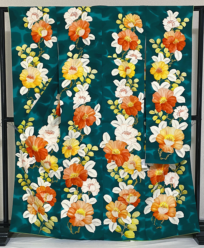確りとした手触りの変わり一越の生地を緑色濃淡に地染めし、大きな花柄を紅色や山吹色と薄ピンク色・黄色などで重ね染めした品。八掛けは正絹黄緑色暈し胴裏は正絹が付いた手縫い仕立て。衿裏にはホック代わりに糸が付いています。