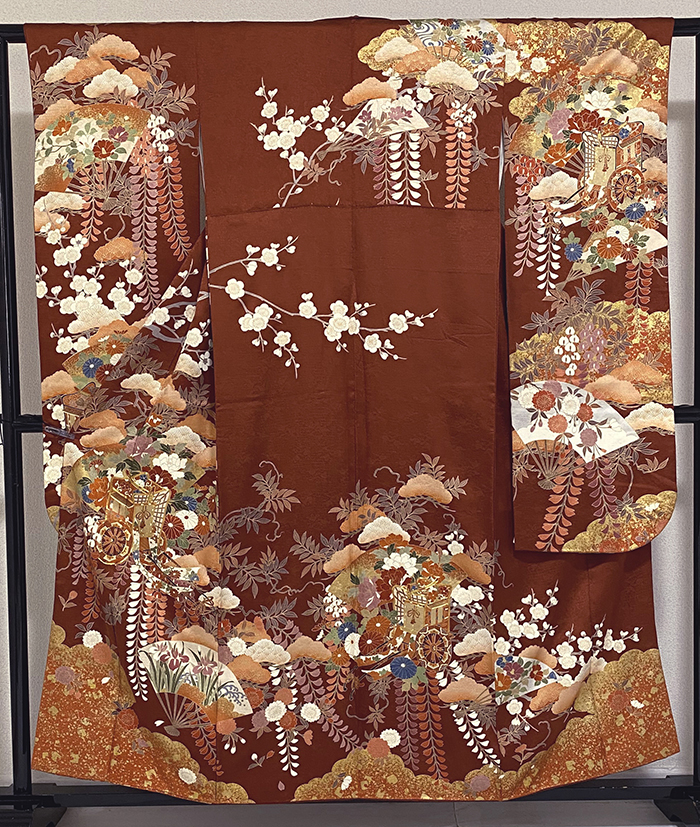 確りとした良い手触りで小さな流水と小花の地柄を織り込んだ紋意匠の生地を海老茶色に地染めし、御所車や扇に花などの柄を地色濃淡と薄緑色に薄紫・青色に金彩を加え重ね染めし、金駒刺繍を加え仕上げた品。八掛けは正絹表色無地でオクミ裏に柄を置き胴裏は正絹が付いた手縫い仕立て。