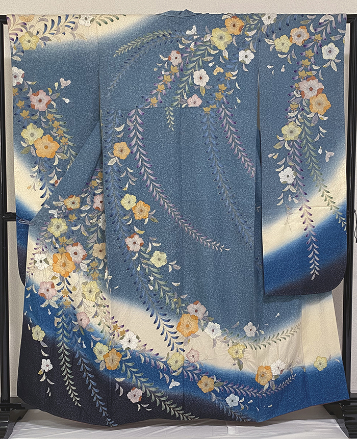 張りのある手触りで確りと打ち込まれ銀糸を織り込んだアラレの地柄をフクレ織りで織り込んだ紋意匠の生地を青ネズ濃淡に地染めし、花の柄をオレンジ色や薄い黄色・くすんだピンク色などで重ね染めした品。八掛けは正絹エンジ色無地でオクミ裏に柄を置き胴裏は正絹が付いた手縫い仕立て。