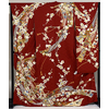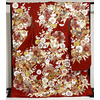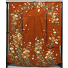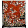 華やかで豪華な仕上がりの加工で、確りとした張りのあるサヤガタと小花を織り込んだ光沢のある紋意匠生地を深い赤色に染め、その上に花柄を白と紫色に金茶色や緑色に金糸金彩などを加えて丁寧に仕上げた品。八掛けは正絹エンジ色無地で胴裏は正絹が付いた手縫い仕立て。衿裏にはくるみホックが付いています。