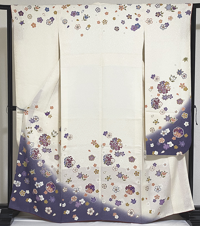 明るい上品で清楚な雰囲気で、確りとした良い手触りのアラレ柄の中に金糸を少し織り込んだ紋意匠生地で、生成りの白に染め、裾は落ち着いた青紫色暈しに染め、その上の花柄を紫色や青色に黄赤色や金茶色で花の一部に金彩と金糸刺繍を施した品。八掛けは正絹深い赤色無地で胴裏は正絹が付いた手縫い仕立て。パールトーン加工済み、下前衿先裏にタグがあります。
