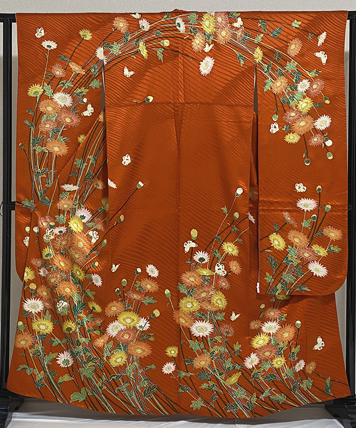 確りとした手触りの良い斜めに流れる光沢のある紋意匠生地を深い黄赤色に地染めし、その上の花や蝶の柄を緑色濃淡と薄ピンク色に金茶色と金彩などで染め、少しの金駒刺繍を施した品。八掛けは正絹オレンジみの黄赤色暈しで胴裏は正絹が付いた手縫い仕立て。
