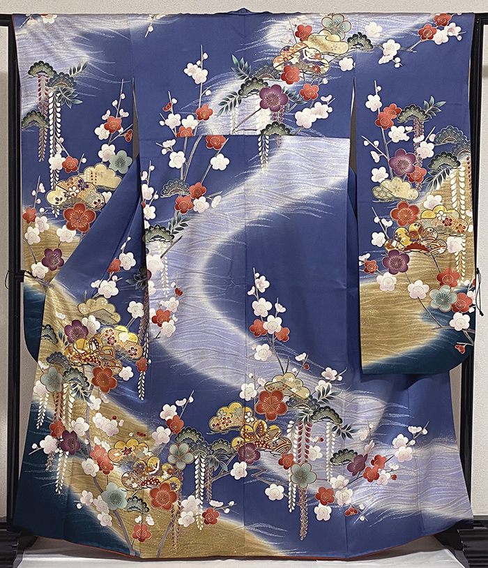 しなやかな手触りの光沢のある緞子アラレ織り生地をくすんだ青色に地染めし、上前からの金茶色の流水暈しとミントグリーン色の裾暈しの上に、花柄を紫色に黄赤色とベージュ色に金彩などで染め、少しの金駒刺繍を施した品。八掛けは正絹エンジ色無地で胴裏は正絹が付いた手縫い仕立て。衿裏にはくるみホックが付いています。