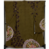 確りとした張りのある花柄を織り込んだ上質な紋意匠生地をくすんだ渋いカーキ色に地染めし、枝垂れ桜の柄を小豆色濃淡と少しの金彩で染め、、個性ある上前の大きな雪輪柄や小花の周りに金彩を霜降りに染め、花柄と疋田柄を黄赤色や緑色に金茶色とエンジ色などで染めた品。八掛けは正絹エンジ色に白と金彩で小花の柄を染めた品が付き、胴裏は正絹が付いた手縫い仕立て。