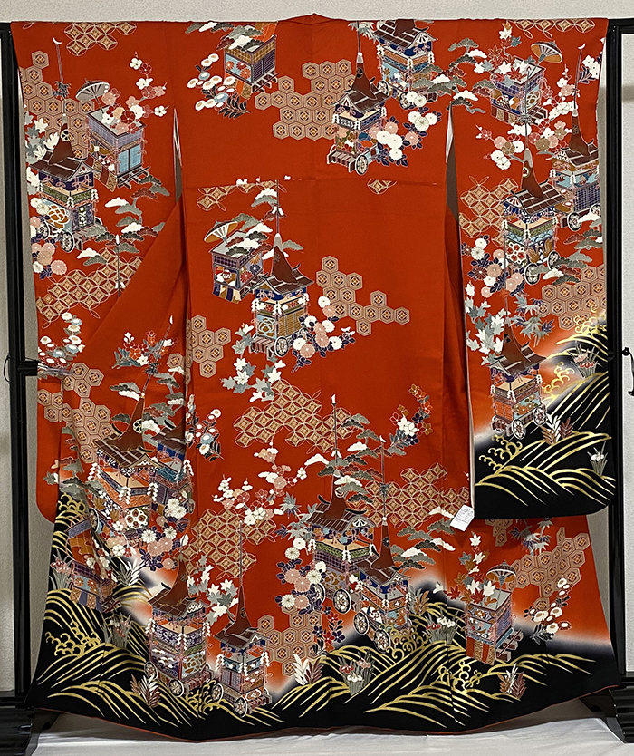 確りとした張りのあるサヤガタを織り込んだ紋意匠生地を黄赤色が加わった赤色に地染めし、裾は黒の暈しで染め、その上の薙刀鉾や花柄などを赤紫色と青色に金茶色やウグイス色・金彩などで染め、金彩と少しの金駒刺繍を縁取りに仕上げた品。八掛けは正絹表色無地でオクミ裏に柄を置き胴裏は正絹が付いた手縫い仕立て。衿裏にはホック代わりに糸が付いています。パールトーン加工済み、下前衿先裏にタグがあります。
