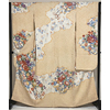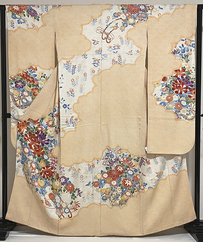 しなやかな手触りの花サヤガタを織り込んだ綸子生地で、白地に花柄を紫色や青色に黄赤色などで染め、流れる雲や裾には薄オレンジ色のくすんだ色で鹿の子絞りに染めた品。八掛けは正絹くすんだベージュ色暈しで胴裏は絹交織が付いた手縫い仕立て。
