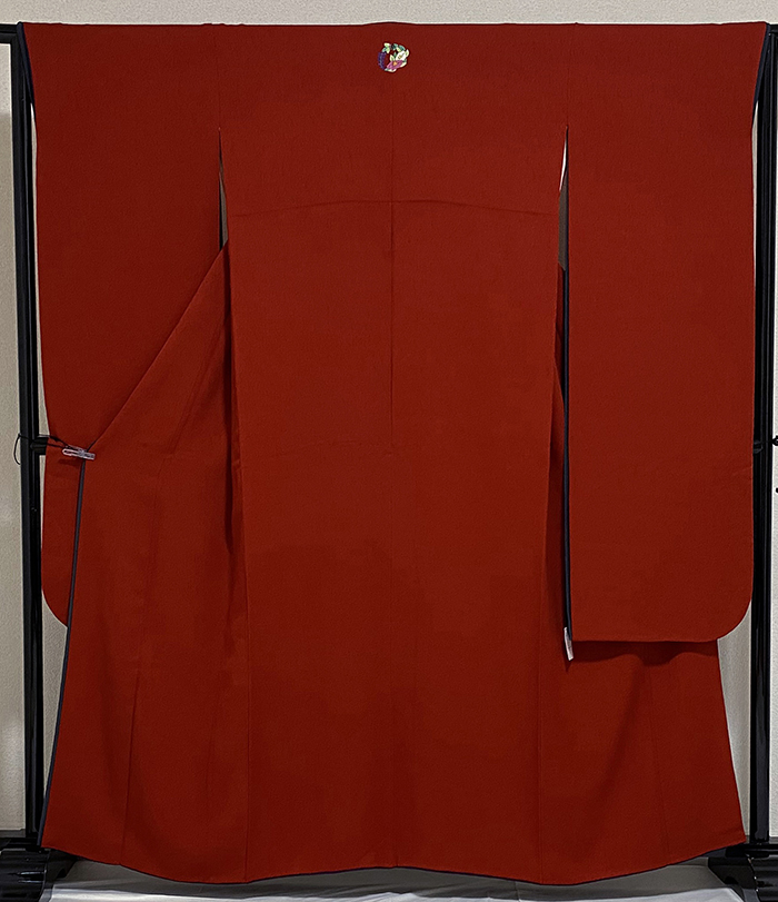 確りとした良い手触りの菱柄に小花を織り込んだ上質な紋意匠生地を深い赤色に染め、几帳と熨斗目に花柄を白と紫色と金茶色と緑色と金彩などに金糸刺繍を加えて染めた品。八掛けは正絹深い赤色無地でオクミ裏に柄を置き胴裏は正絹が付いた手縫い仕立て。
