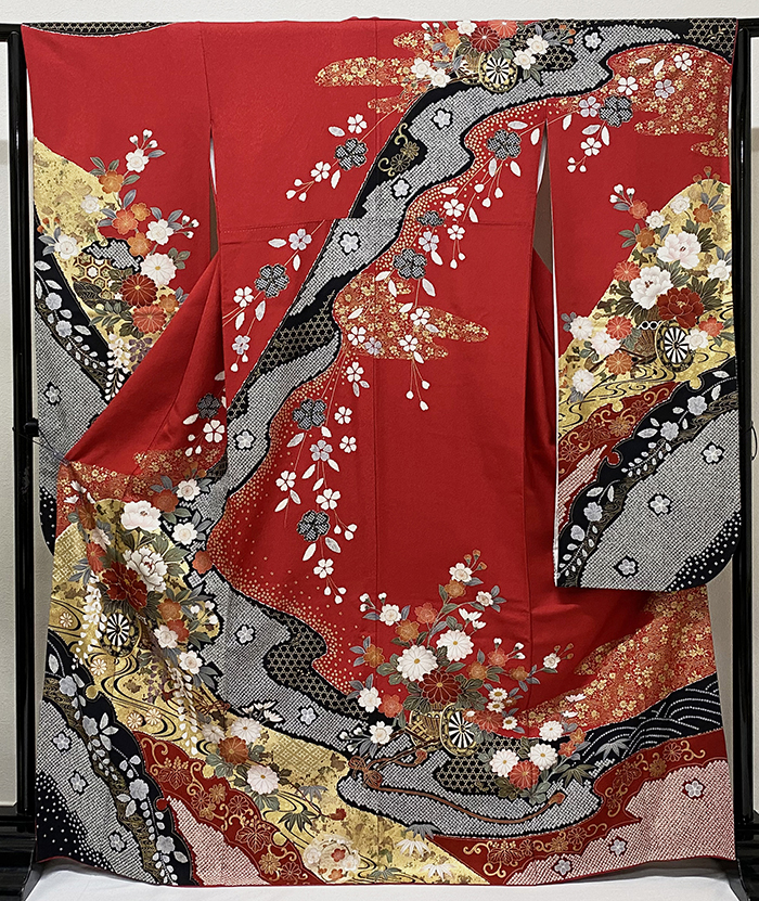 確りとした手触りで小さなアラレの地柄を織り込んだ上質な紋意匠の生地を深みのエンジ色に地染めし、流水取り鹿の子柄と花車などの柄を黒や白・薄紫色・ウグイス色・金箔などで重ね染めし、金駒刺繍を加え仕上げた品。八掛けは正絹エンジ色無地で胴裏は正絹が付いた手縫い仕立て。衿裏にはくるみホックが付いています。下前オクミに作家落款があります。