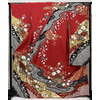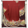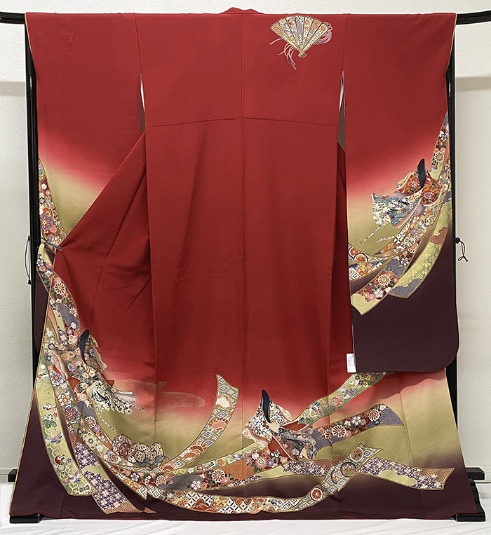 確りとした張りのある良い手触りの変わり一越の生地を暗い朱赤色に地染めし、こげ茶色の裾暈しと、上前からの熨斗目や姫などの柄を白ネズやウグイス色・黄赤色・薄紫色・金彩・金糸刺繍を加え重ね染めした品。八掛けは正絹エンジ色無地でオクミ裏に柄を置き胴裏は正絹が付いた手縫い仕立て。衿裏にはくるみホックが付いています。袖口と上前に赤色や黄色・青緑色の3色の付け比翼が付き、同色の重ね衿が付いています。