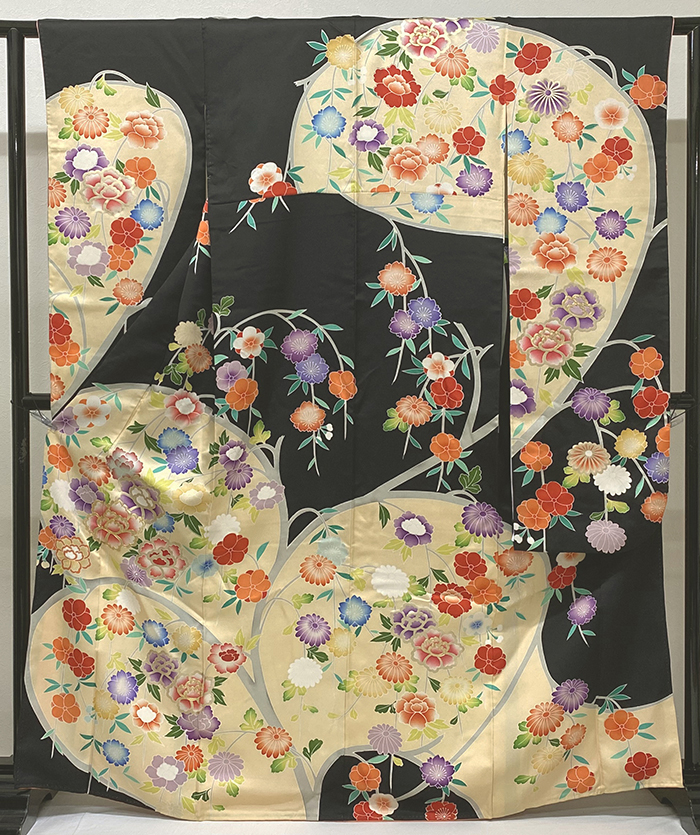 しなやかな手触りの無地意匠の生地を明るいベージュ色と黒の染め分けに地染めし、花柄を薄紫色や緑色・エンジ色・青色・金彩などで重ね染めし、少しの金駒刺繍を加え仕上げた品。八掛けは正絹薄オレンジ色暈しで胴裏は正絹が付いた手縫い仕立て。衿裏にはホック代わりに糸が付いています。