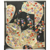 確りとした手触りの小花を織り込んだ紋意匠生地で、墨色や薄紫色にエンジ色や茶色に薄ピンク色などで道長取りに染め分けし、花や流水と扇などの柄を地色や金彩で染め、少しの金駒刺繍を加え仕上げた品。八掛けは正絹ピンク色暈しで胴裏は正絹が付いた手縫い仕立て。衿裏にはくるみホックが付いています。
