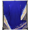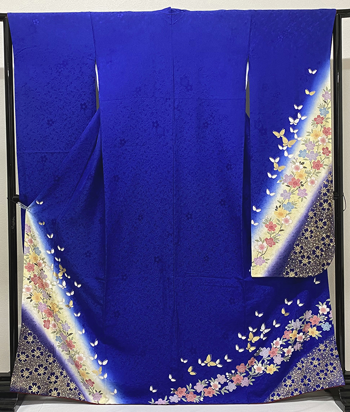 確りとした良い手触りの小花と霜降りの地柄を織り込んだ紋意匠の生地を鮮やかな青色に地染めし、淡い黄色と黒に近い紫色の裾暈しと、花や蝶などの柄を薄紫色や黄赤色・青色・緑色に、金彩と金糸刺繍を加え重ね染めした品。八掛けは正絹エンジ色無地で胴裏は正絹が付いた手縫い仕立て。