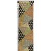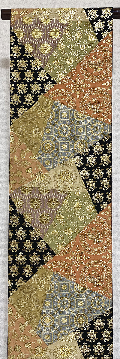確りとした張りのある錦の地織りで、黒の地織りに大きなキリバミ柄と花鳥柄を黄赤色やウグイス色に青ネズ色や赤紫色に金糸金箔で細かく織った品。