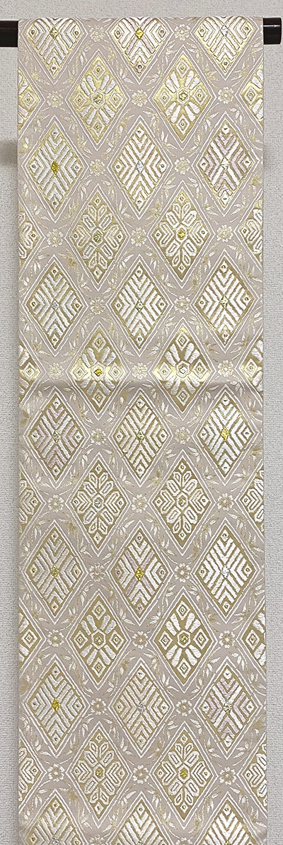しなやかな手触りの淡い藤ネズ色の地織りに、唐織りで菱柄と抽象柄を加え、白ネズ色と金彩と金銀糸を加え織った品。