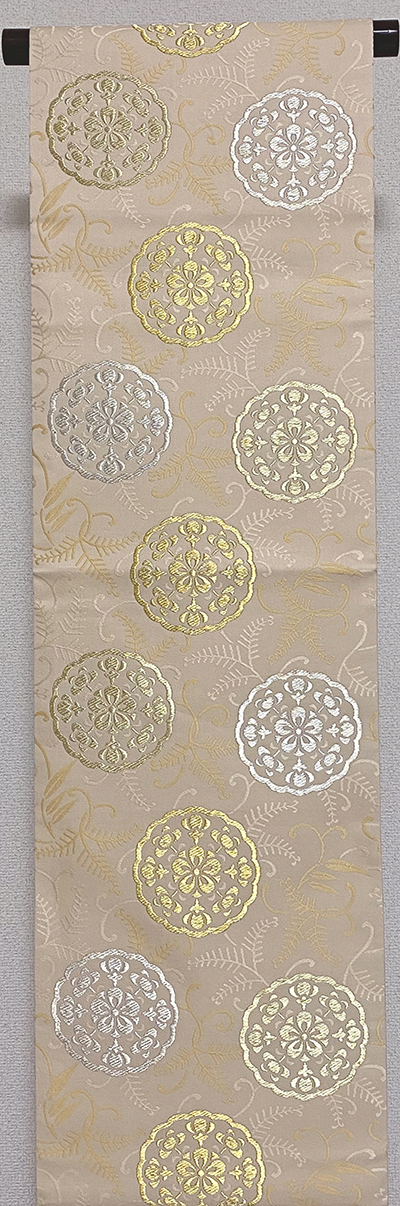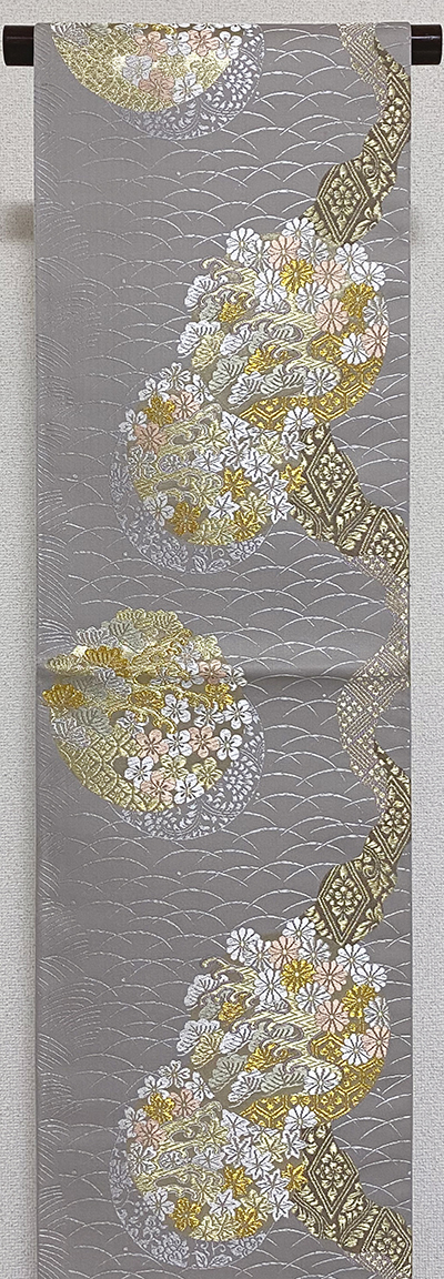 確りとした張りのある錦の織りで、白ネズ色のくすんだ地織りに、小さな露芝と大きな丸の中には金糸金箔と薄紫色に撫子色などを加えて織った品。