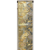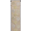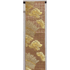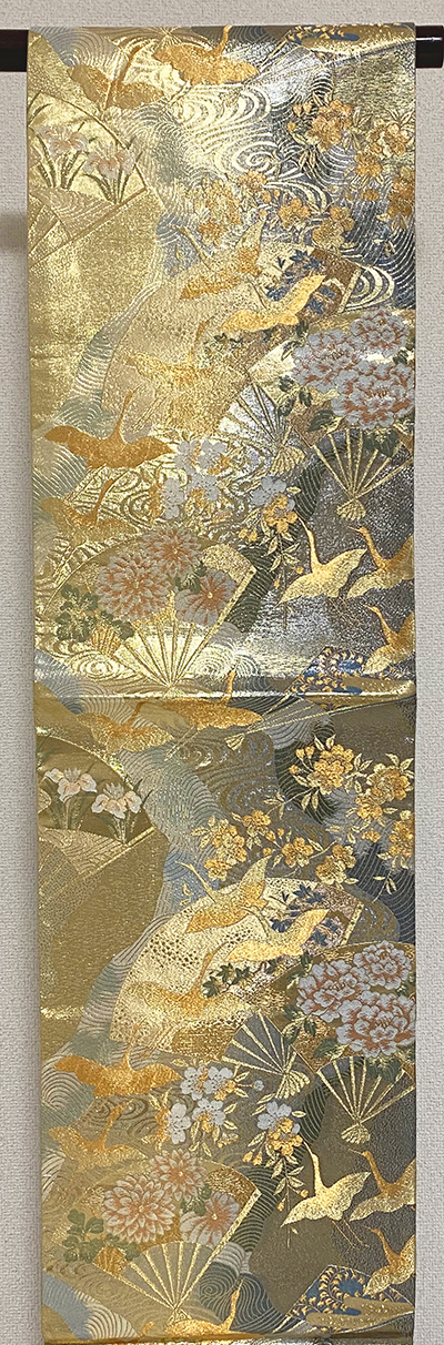 確りとした張りのある錦の織りで、金箔の地織りに扇や花鳥柄などを金茶色や薄緑色に少しの黄赤色などを加えて織った品。