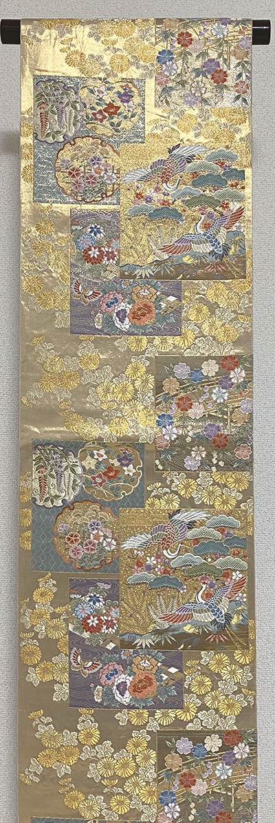 確りとした張りのある本金箔錦織り生地で、金箔の地織りに、花柄や大きな四角柄などを薄紫色やベージュ色に黄赤色と青ネズ色に、一部を唐織りに織り上げた品。