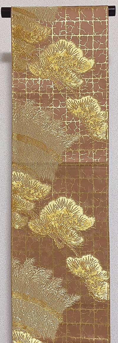 しなやかな手触りの錦の地織りで、くすんだローズ色の地織りに、松や竹に四角柄などを2種類の濃淡金糸で織った品。
