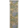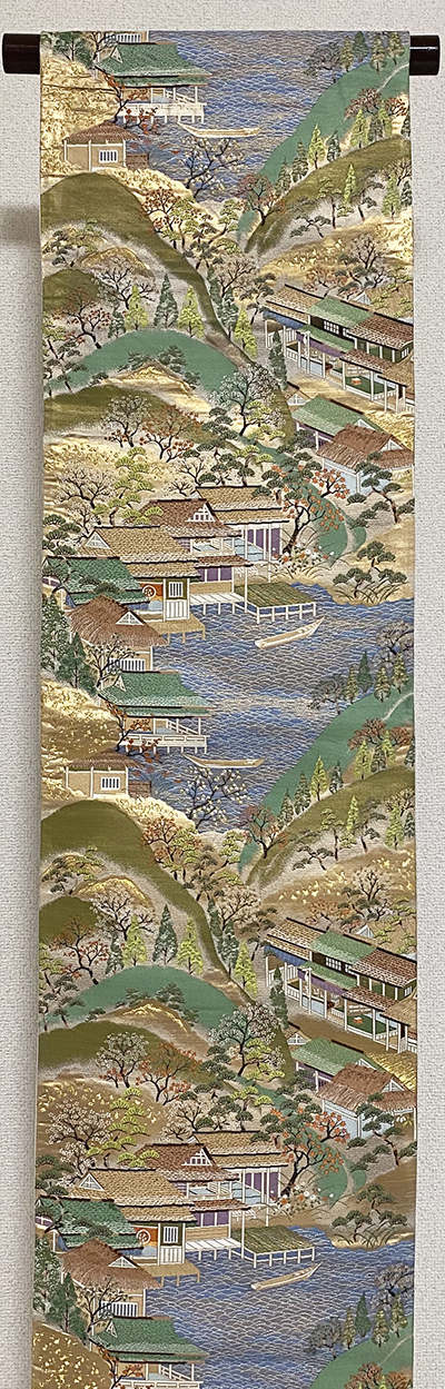 確りとした良い手触りの錦織り生地で、山柄や家に湖などの柄を緑色や金茶色に薄紫色と黄赤色と青ネズ色に金糸などを織り込んだ凝った品。