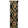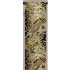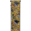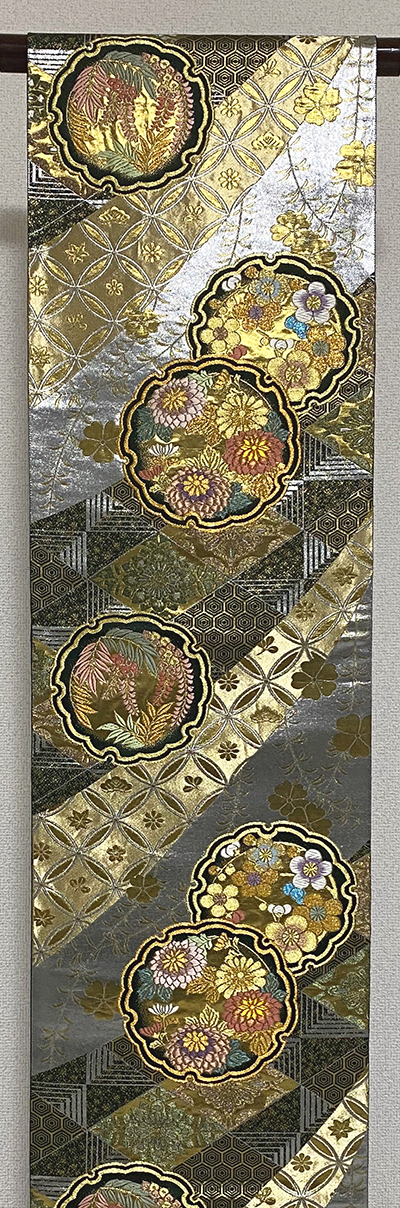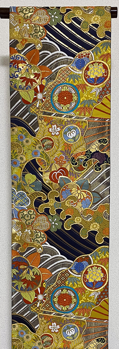 張りのある手触りで確りと打ち込まれた黒に近い色の豪華な錦地織りに、波や扇に花柄を白ネズと黄赤色に薄緑色や青ネズ・紫色に金糸金箔を加え重ね織りした品。