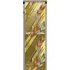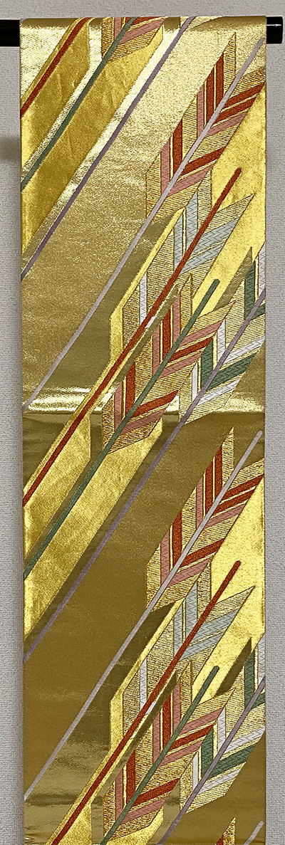 張りのある手触りで確りと打ち込まれた生成りに金の引き箔を重ねた錦地織りに、斜め矢羽根の柄を金茶色やエンジ色・青ネズなどに金糸を加え重ね織りした品。